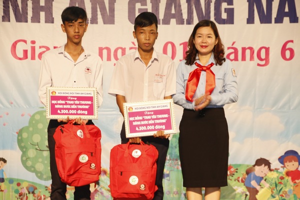 Dịp này, Hội đồng Đội tỉnh đã tuyên dương 200 thiếu nhi vượt khó học giỏi tiêu biểu và trao tặng các giải thưởng, học bổng cho thiếu nhi như: Giải thưởng Kim Đồng năm 2019, Học bổng Doraemon, Học bổng Công trình măng non với tổng trị giá trên 100 triệu đồng. Ngoài ra, Ban Giám đốc Nhà Thiếu nhi An Giang còn trao 02 sổ tiết kiệm, trị giá 10 triệu đồng/sổ và 10 góc học tập cho các em có hoàn cảnh khó khăn, tham gia tích cực các CLB - Đội nhóm tại Nhà thiếu nhi, trị giá 10 triệu đồng.