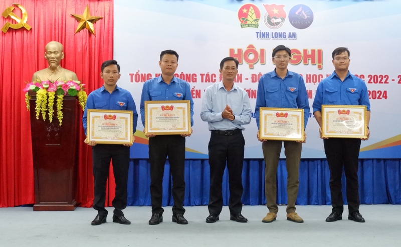 Hình 2. Đồng chí Trần Hải Phú - Bí thư Tỉnh Đoàn Long An và Đồng chí Phạm Văn Hậu - Phó Bí thư Tỉnh Đoàn - Chủ tịch Hội đồng Đội tỉnh trao bằng khen và cờ thi đua cho các đơn vị đạt thành tích xuất sắc trong công tác Đội và phong trào thiếu nhi năm học 2022-2023