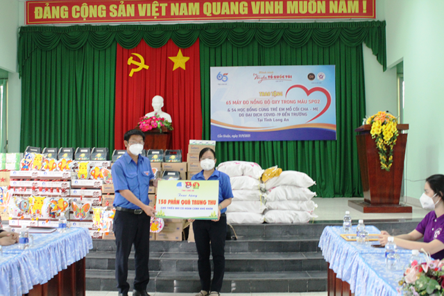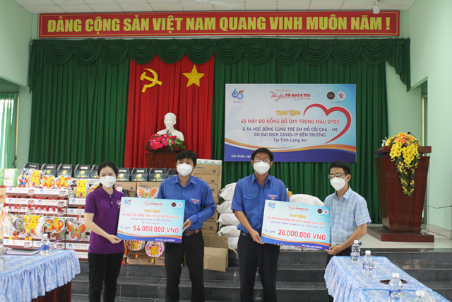 Đơn vị đồng hành trao bảng tượng trưng hỗ trợ 54 phần quà hỗ trợ thiếu nhi mồ côi và 65 máy đo nồng độ oxy SPO2 cho Tỉnh đoàn Long An