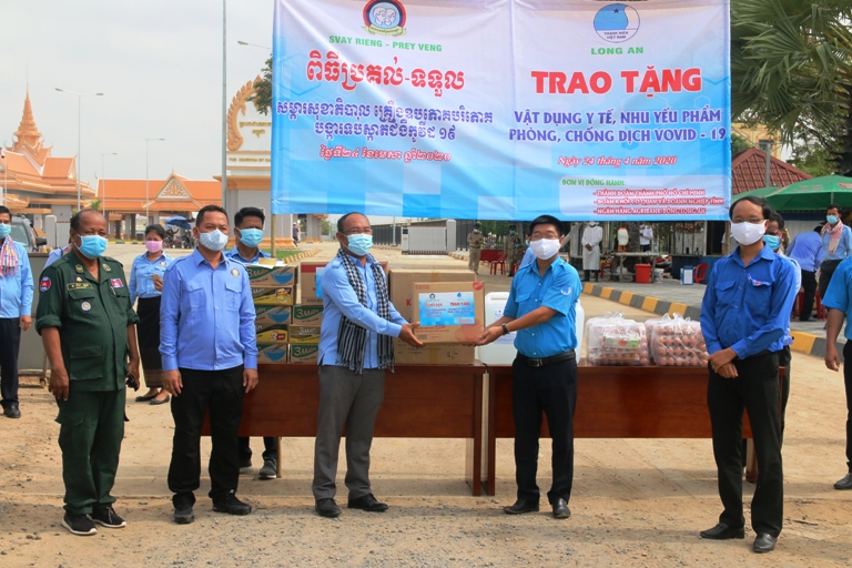 Hội LHTN Việt Nam tỉnh Long An tặng vật tư y tế và các nhu yếu phẩm hỗ trợ công tác phòng chống dịch Covid-19 cho Liên đoàn Thanh niên Campuchia tỉnh Svay-Rieng và Prey-Veng, Vương quốc Campuchia