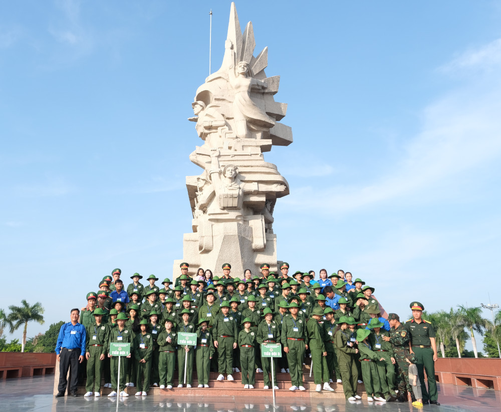 Ngay sau lễ xuất quân, 70 chiến sĩ nhỏ cùng đại biểu tham quan Tượng đài Long An "trung dũng kiên cường, toàn dân đánh giặc"./.