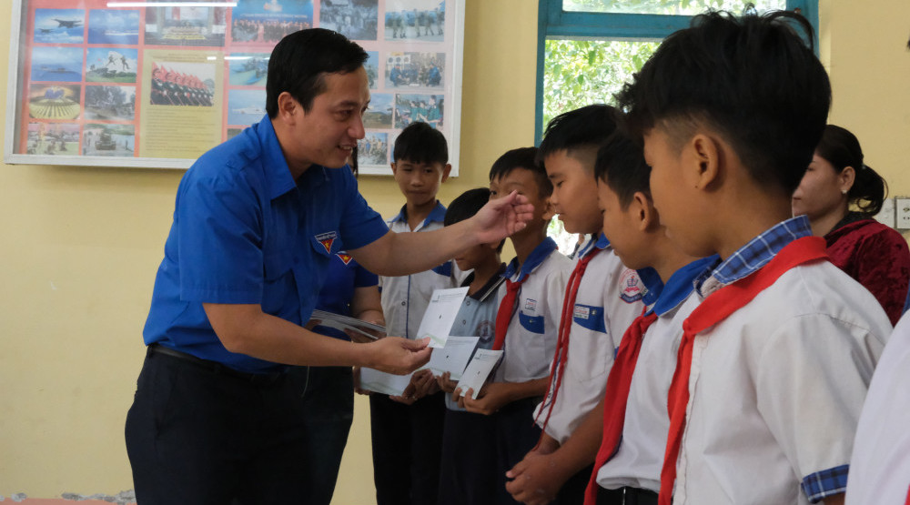 Đồng chí Trần Hải Phú, Bí thư Tỉnh đoàn Long An trao quà cho các học sinh tại xã Bình Thạnh, huyện Mộc Hóa