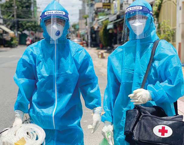Thường công việc sẽ bắt đầu lúc 7h30 sáng và kết thúc vào lúc 17h chiều hoặc có khi muộn hơn. Tấn thuộc nhóm phản ứng nhanh của trạm y tế phường nên còn trực buổi tối tại trạm y tế và làm việc 24/24. “Đúng như tên gọi, khi có cuộc gọi đến trạm y tế báo có ca F0 đang cách ly tại nhà lên cơn khó thở hoặc trở nặng thì chúng em phải lập tức đến nhà họ để xem tình hình, cấp cứu và có thể chuyển tuyến cho họ nếu nặng”, Tấn cho hay.