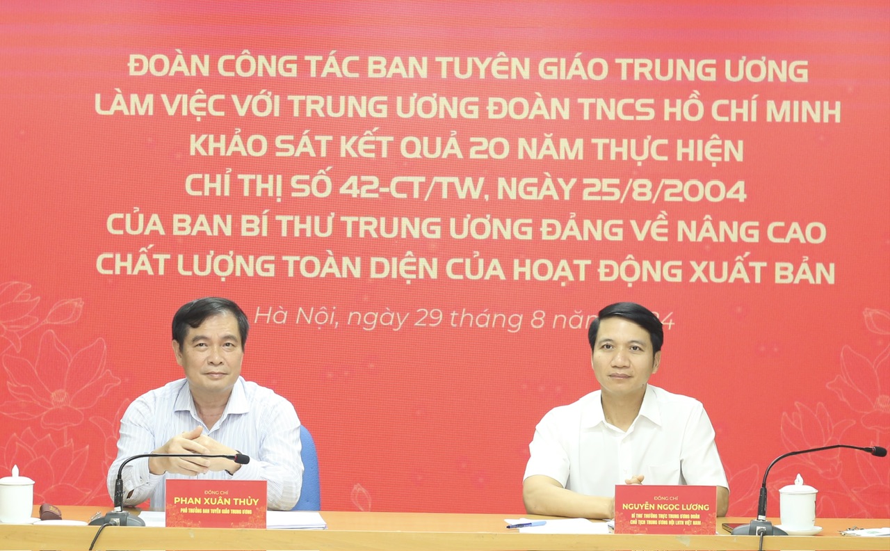 Kết luận buổi làm việc, đồng chí Phan Xuân Thủy ghi nhận, đánh giá cao công tác lãnh đạo, chỉ đạo thường xuyên, quyết liệt, triển khai thực hiện nghiêm túc, hiệu quả Chỉ thị 42 của T.Ư Đoàn. Trong đó, kết quả nổi bật là T.Ư Đoàn quan tâm tạo điều kiện để các nhà xuất bản hoạt động tốt nhất.