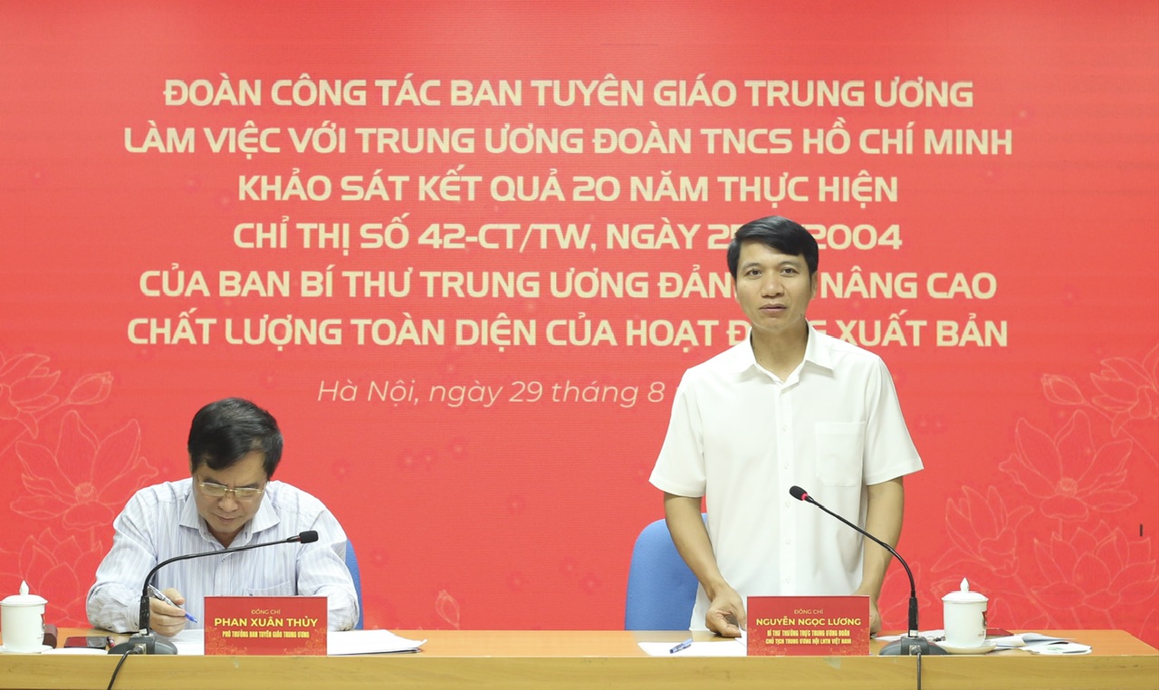 Phát biểu tại buổi làm việc, đồng chí Nguyễn Ngọc Lương nhấn mạnh, Ban Bí thư T.Ư Đoàn thống nhất nhận thức về tầm quan trọng của xuất bản, văn hóa đọc đối với đời sống xã hội, nhất là với thanh niên. Chính vì vậy, Bí thư T.Ư Đoàn đã tập trung lãnh đạo, chỉ đạo triển khai thực hiện Chỉ thị số 42 rất nghiêm túc.