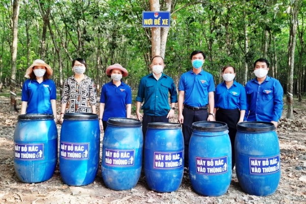 Đoàn viên, thanh niên công ty TNHH MTV Cao su Dầu Tiếng trang bị thùng rác tại các điểm tổ sản xuất Nông trường Thanh An, dọn vệ sinh vườn cây làm điểm để xe