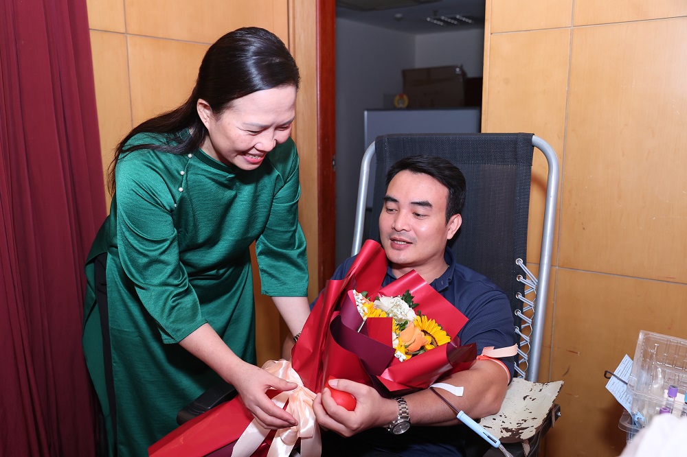 ThS. BS. Vũ Thị Hồng Phương - Phó Giám đốc Trung tâm Máu Quốc gia, Viện Huyết học - Truyền máu TW và Bí thư Đoàn thanh niên Tập đoàn Bưu chính Viễn thông Việt Nam Nguyễn Quang Long tặng hoa cho ĐVTN, CBCNV tham gia hiến máu tình nguyện