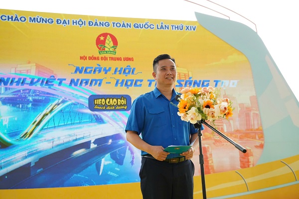 Đồng chí Lê Anh Quân, Phó Chủ tịch Hội đồng Đội Trung ương, Giám đốc Trung tâm Hỗ trợ và Phát triển thiếu nhi Việt Nam phát biểu tại Ngày hội
