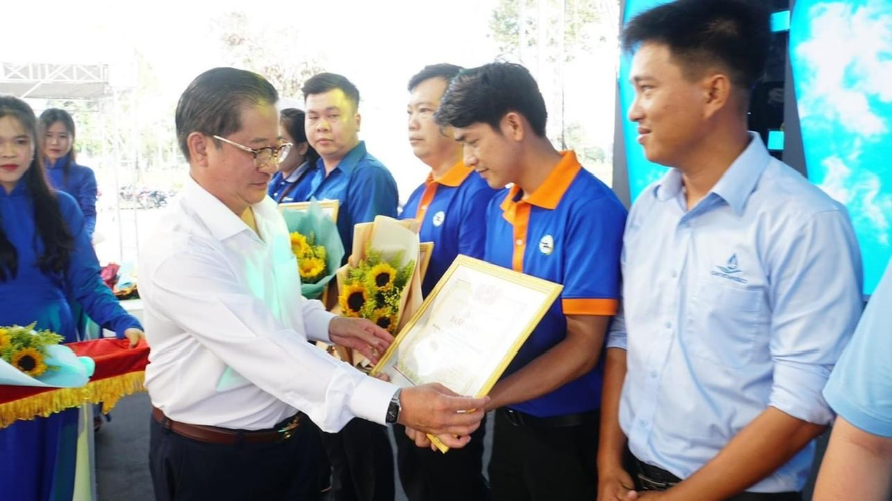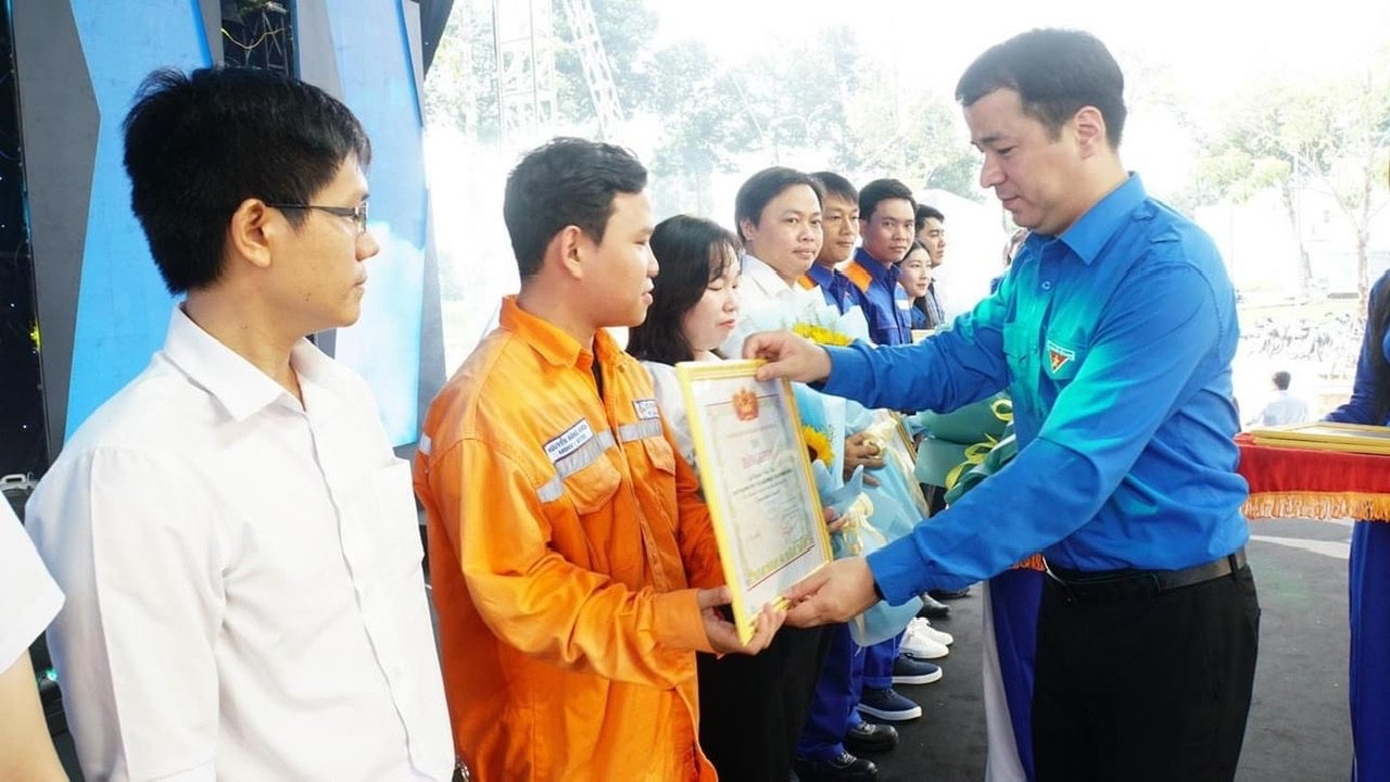 Đồng chí Ngô Văn Cương, Bí thư Trung ương Đoàn, Chủ nhiệm Ủy ban Kiểm tra Trung ương Đoàn và đồng chí Trần Việt Trường, Phó Bí thư Thành ủy, Chủ tich UBND TP Cần Thơ trao Bằng khen cho các gương thanh niên công nhân tiêu biểu trong lao động sản xuất tại TP Cần Thơ