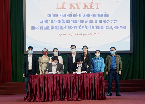 Lễ ký kết Chương trình phối hợp giữa Hội Sinh viên tỉnh và Hội Doanh nhân trẻ tỉnh Nghệ An giai đoạn 2022 - 2027 trong tư vấn, hỗ trợ nghề nghiệp và việc làm cho học sinh, sinh viên