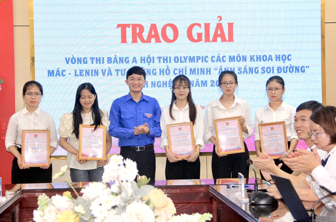 Đồng chí Trần Linh - Phó Bí thư Tỉnh đoàn, Chủ tịch Hội Sinh viên tỉnh khen thưởng các thí sinh xuất sắc Vòng thi bảng A Hội thi Olympic các môn khoa học Mác – Lênin và tư tưởng Hồ Chí Minh “Ánh sáng soi đường” tỉnh Nghệ An năm 2023.