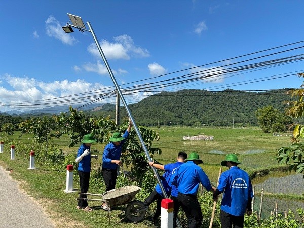 Lực lượng sinh viên tình nguyện thực hiện công trình Thắp sáng đường quê tại xã Châu Phong, huyện Quỳ Châu. Ảnh: Trường Đại học Sư phạm kỹ thuật Vinh