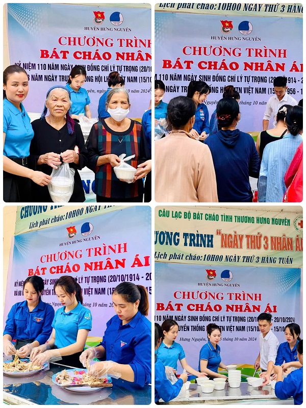 Ban Thường vụ Huyện đoàn - Hội Liên hiệp Thanh niên Việt Nam huyện Hưng Nguyên tổ chức Chương trình Bát cháo nhân ái cho người bệnh có hoàn cảnh khó khăn đảm bảo sức khỏe để tiếp tục điều trị mà còn tiếp thêm niềm tin, nghị lực để họ vượt qua khó khăn, bệnh tật.