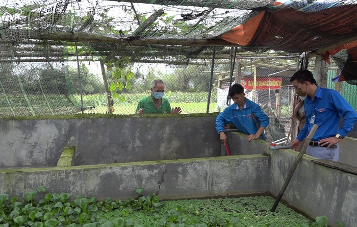 Anh Vị thí điểm nuôi ốc bươu. Ảnh NVCC