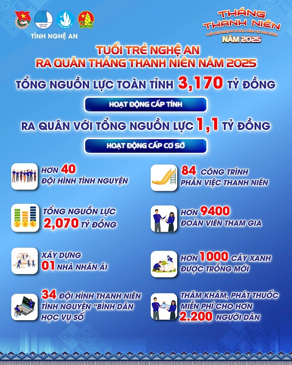 Với nhiều ý nghĩa quan trọng của Tháng Thanh niên năm nay, với sự năng động, sáng tạo của tuổi trẻ, cùng với sự ủng hộ của các cấp uỷ Đảng, chính quyền, các ban, ngành, đoàn thể và xã hội toàn tỉnh Nghệ An, tin tưởng rằng, Tháng Thanh niên năm 2025 sẽ giành nhiều thắng lợi, góp sức trẻ chào mừng Đại hội Đảng các cấp, nhiệm kỳ 2025-2030.