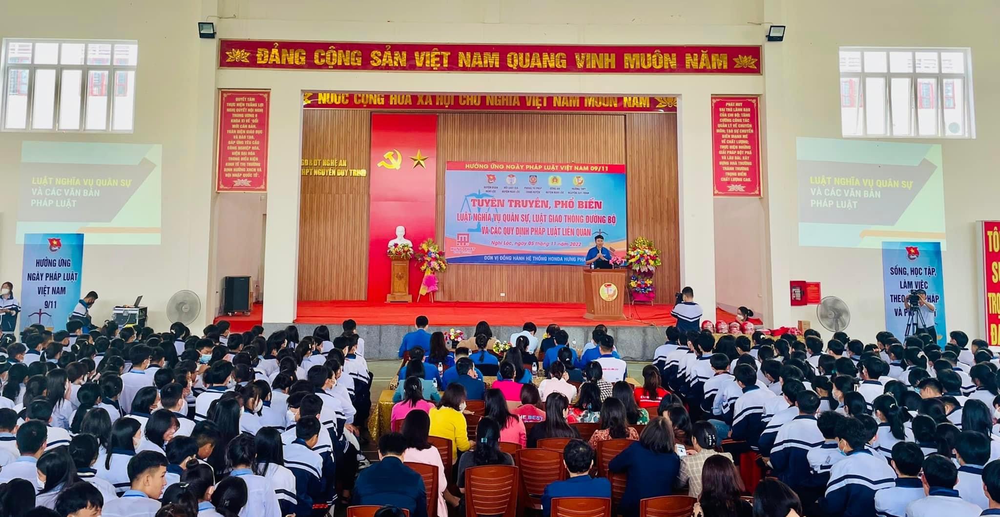 Hơn 1200 đoàn viên, thanh niên huyện Nghi Lộc tham gia Tuyên truyền, giáo dục luật nghĩa vụ quân sự, luật giao thông đường bộ 2008 và các quy định pháp luật liên quan tại trường THPT Nguyễn Duy Trinh.(Ảnh: Huyện đoàn Nghi Lộc).
