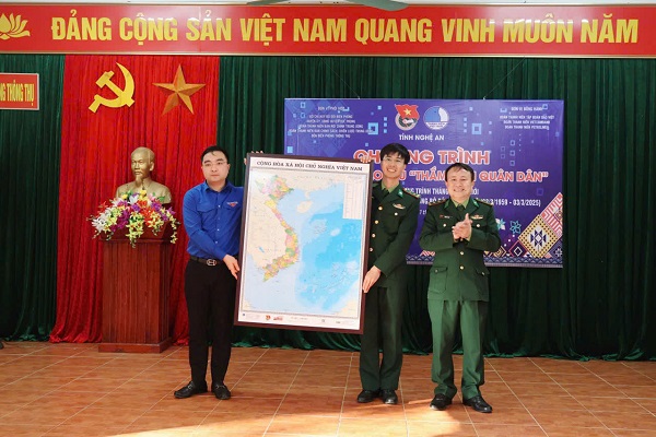 Đoàn công tác trao tặng quà và bản đồ Việt Nam cho Đồn Biên phòng Thông Thụ