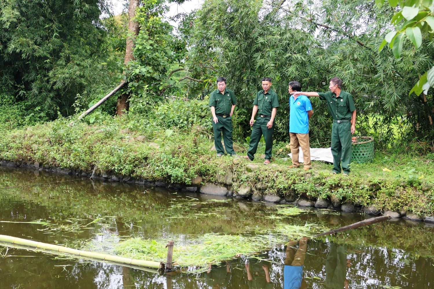 Cựu chiến binh Lù Văn Nò (thứ nhất bên phải) cùng đồng đội tham quan mô hình kinh tế vườn - ao - chuồng của gia đình.