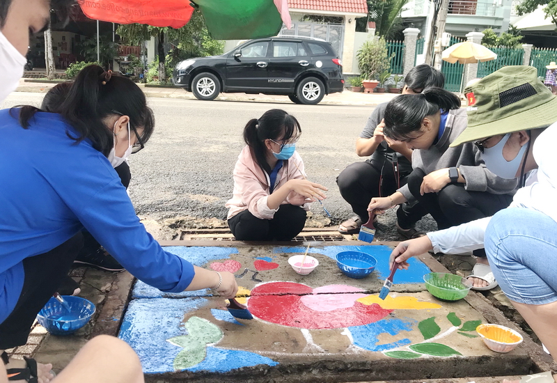 Bằng bàn tay khéo léo, tẩn mẩn, các bạn trẻ đã không ngại tiết trời nắng nóng, tranh thủ thời gian rảnh rỗi để chung tay giúp những chiếc nắp cống với vẻ ngoài thô kệch ban đầu được khoác lên mình “chiếc áo mới” với những bức họa về thiên nhiên, hoa cỏ đầy màu sắc sinh động.