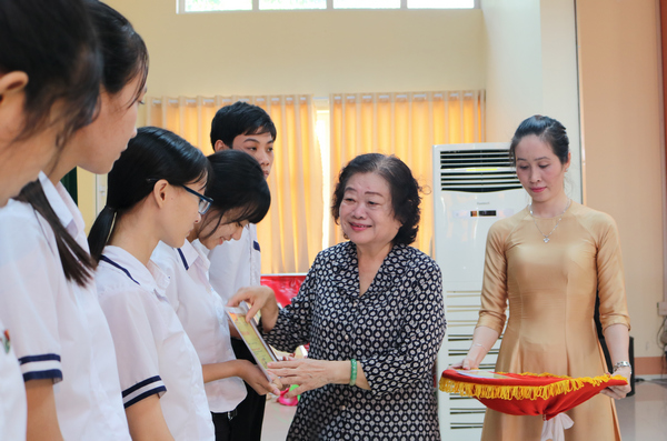Bà Trương Mỹ Hoa - nguyên Phó Chủ tịch nước, Chủ tịch Quỹ học bổng Vừ A Dính, Chủ nhiệm Câu lạc bộ “Vì Hoàng Sa - Trường Sa thân yêu” trao tặng học bổng Vừ A Dính cho học sinh dân tộc thiểu số vượt khó học giỏi ở các huyện An Biên, An Minh, U Minh Thượng và Vĩnh Thuận.