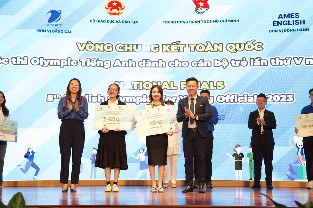 Phó Ban Quốc tế T.Ư Đoàn Trần Hoài Minh và Bí thư Đoàn thanh niên Tập đoàn Bưu chính Viễn thông Việt Nam Nguyễn Quang Long trao giải Nhì cho 02 thí sinh Phạm Thị Việt Trinh- Chuyên viên Sở Nội vụ tỉnh Quảng Nam và Ngô Ngọc Bảo Trân- Ngân hàng TMCP Ngoại Thương Việt Nam, chi nhánh Sài Thành
