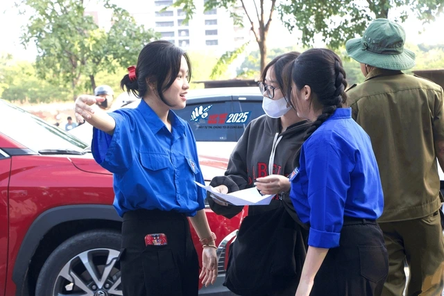 Các tình nguyện viên chỉ đường đến địa điểm thi cho thí sinh