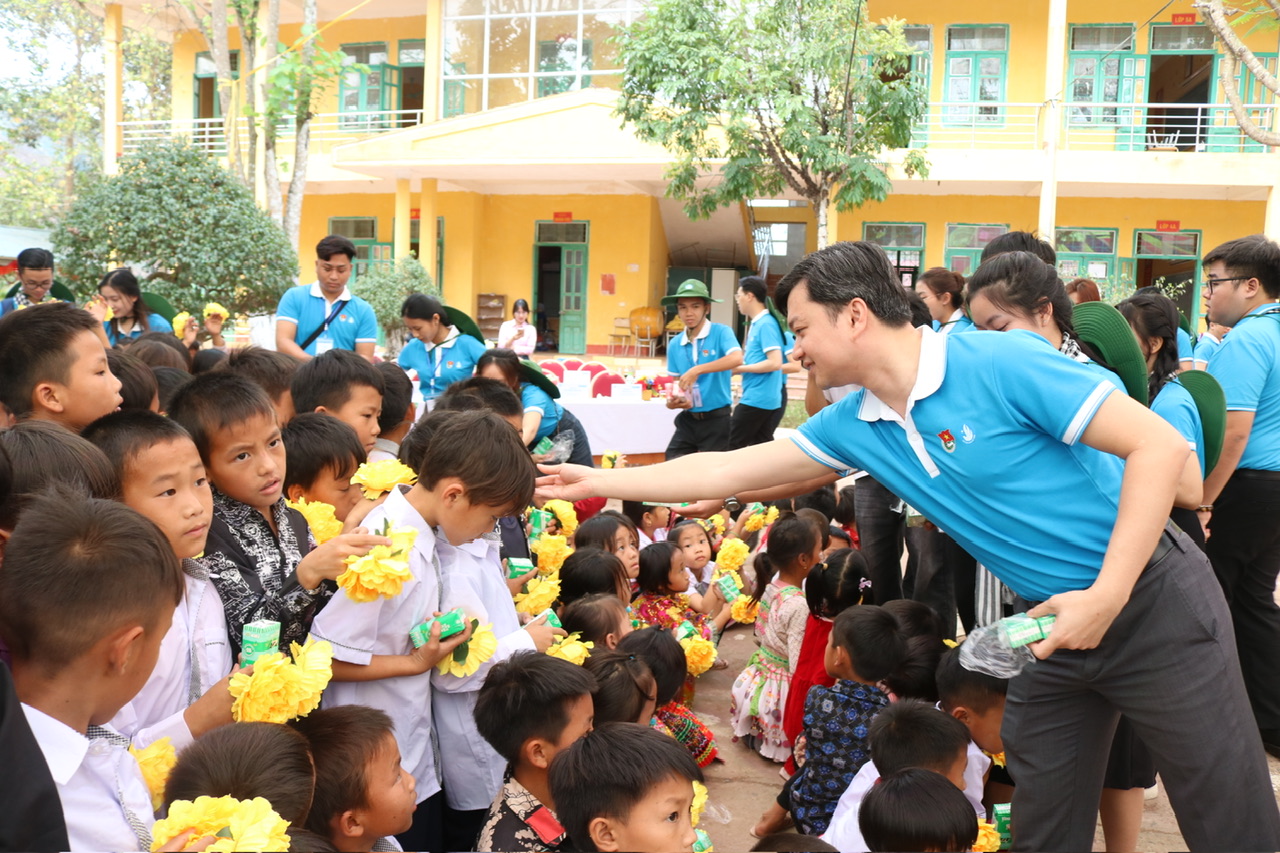 Cô Thuý cho biết, địa bàn xã còn nhiều hộ nghèo, bà con chủ yếu làm nương rẫy, nhiều gia đình đông con nên không có điều kiện cho con ăn học đầy đủ. Bản thân cô Thuý và các thầy cô trong trường phải thường xuyên đến từng gia đình tuyên truyền, vận động phụ huynh cho con đến trường. Hiện trường có 649 học sinh chia làm 6 điểm bản. Điểm xa nhất cách trung tâm 20 km, chưa có điện, đường đi còn khó khăn. Ở điểm trường chính có 14 lớp hơn 400 học sinh ăn ở bán trú. Các em chưa khi nào được uống sữa tươi. Vì thế, khi nghe tin trường được đoàn đại biểu Hội SVVN đến tặng quà, tặng sữa và nấu ăn cho học sinh, cả thầy cô và học trò đều háo hức.