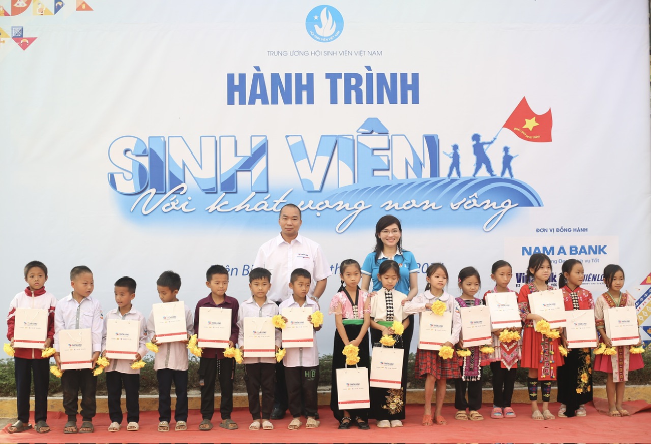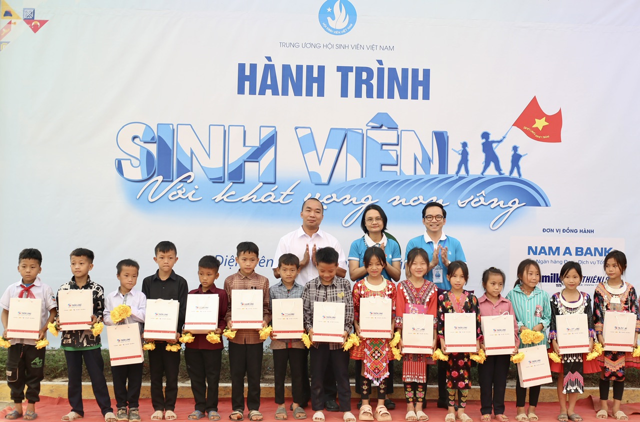Cùng với đó, Công ty Cổ phần tập đoàn Thiên Long đồng hành cùng Hội SVVN trao tặng các phần quà là dụng cụ học tập cho tất cả 428 em học sinh của trường DTBT Tiểu học Nậm Vì trị giá hơn 50 triệu đồng.