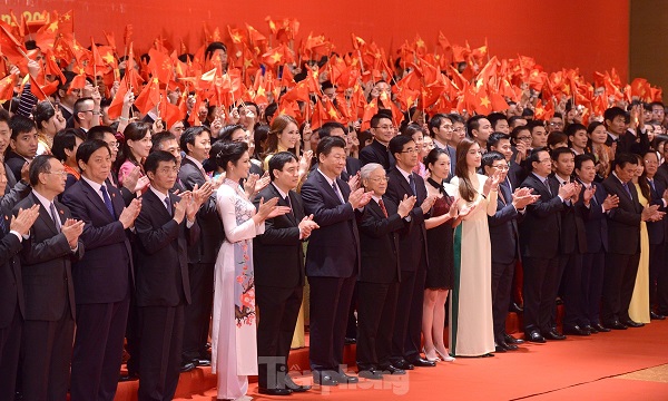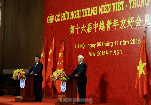 Tổng Bí thư Nguyễn Phú Trọng và Tổng Bí thư, Chủ tịch Trung Quốc Tập Cận Bình tại cuộc Gặp gỡ Hữu nghị Thanh niên Việt Nam - Trung Quốc lần thứ 16. Ảnh: Xuân Tùng