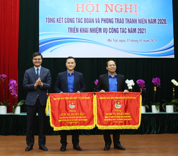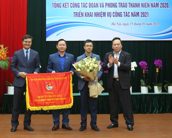 Đồng chí Trần Hữu, Bí thư Đoàn Khối Các cơ quan Trung ương và đồng chí Nguyễn Hải Minh, Trưởng Ban Quốc tế Trung ương Đoàn trao Bằng khen của Trung ương Đoàn TNCS Hồ Chí Minh cho các tập thể có thành tích xuất sắc trong công tác Đoàn và phong trào thanh niên năm 2020.