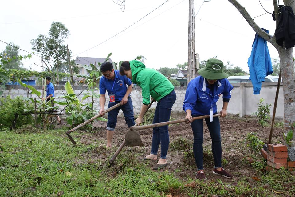 Các cán bộ Đoàn tiêu biểu cuốc đất, dọn cỏ tại vườn nhà các hộ gia đình |