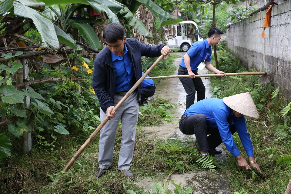 Các đại biểu tham gia phát quang bụi rậm, dọn vệ sinh các khu vực đường thôn, ngõ, xóm |