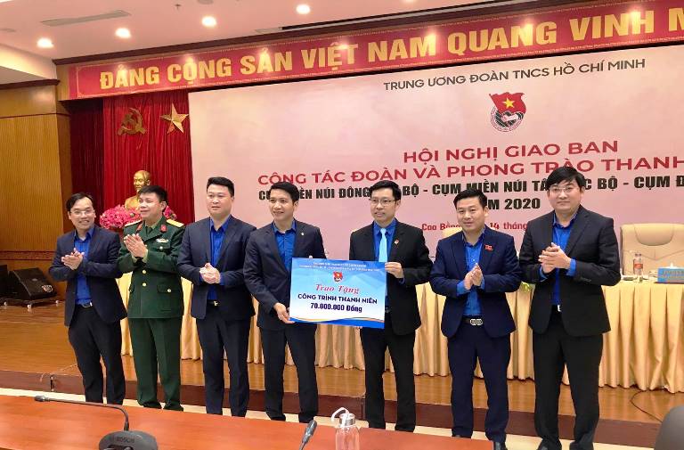 Đồng chí Nguyễn Ngọc Lương, Bí thư Trung ương Đoàn, Chủ tịch Hội đồng Đội Trung ương cùng các đồng chí lãnh đạo trao tặng kinh phí xây dựng công trình thanh niên trị giá 70 triệu đồng cho tỉnh đoàn Cao Bằng