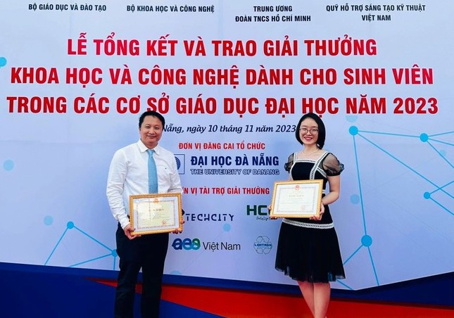 Quỳnh Giang (bên phải ảnh) xuất sắc giành được Giải thưởng Khoa học và Công nghệ dành cho sinh viên trong các cơ sở giáo dục bậc đại học năm 2023