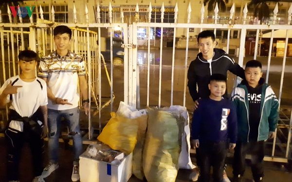 Phan Văn Đức và Đỗ Hùng Dũng bên những bao rác vừa nhặt