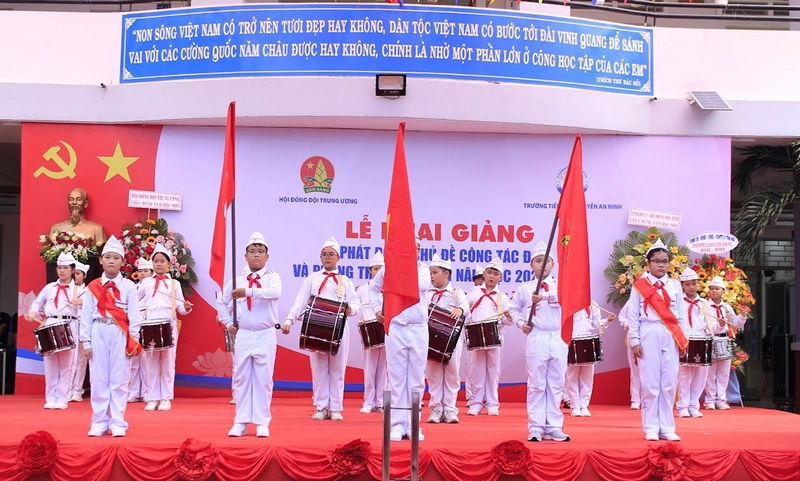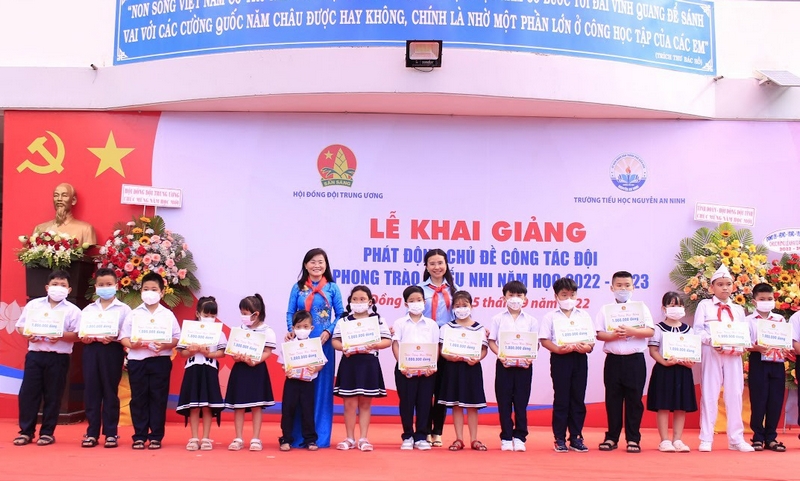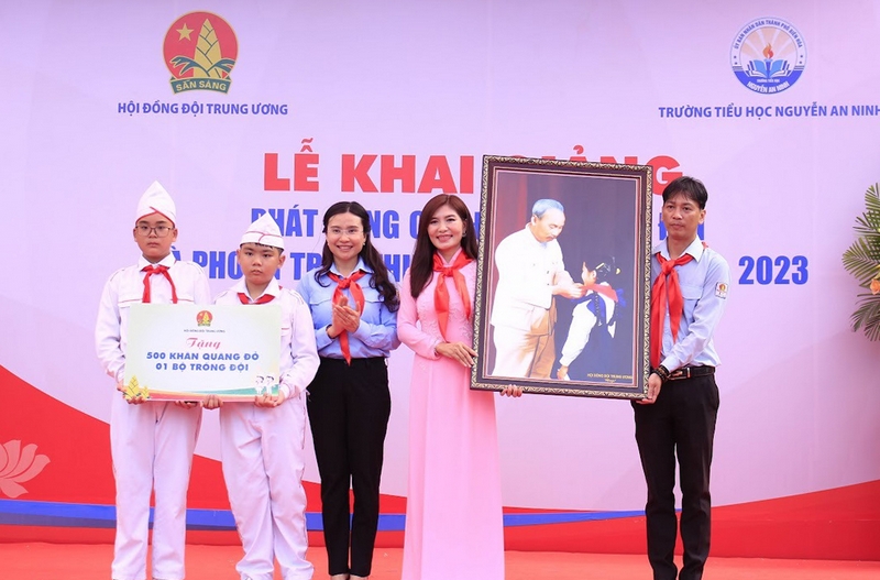 Hội đồng Đội Trung ương trao tặng trường Tiểu học Nguyễn An Ninh bức tranh Bác Hồ quàng khăn đỏ, 500 khăn quàng đỏ, 01 bộ trống Đội