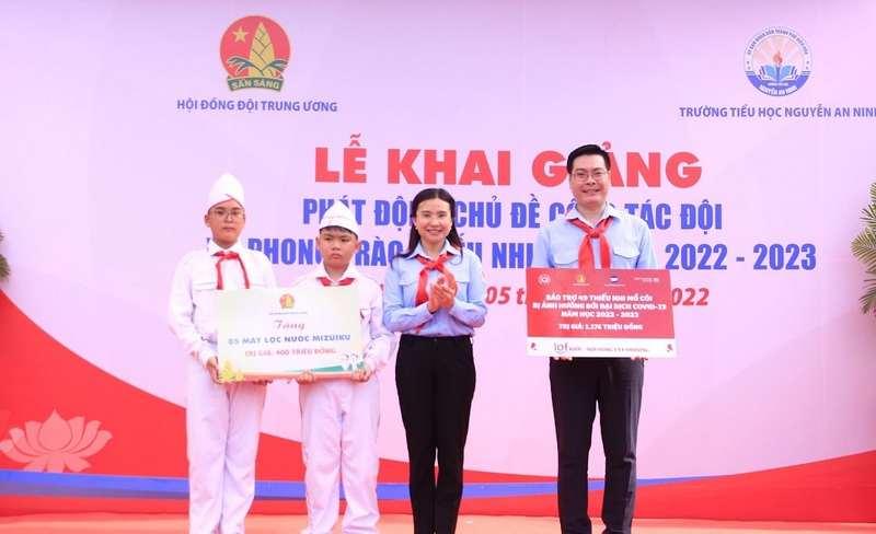 Bên cạnh đó, Trung ương Đoàn, Hội đồng Đội Trung ương trao tặng 5 công trình máy lọc nước Mizuiku trị giá 400 triệu đồng cho 5 trường tiểu học trên địa bàn tỉnh Đồng Nai và trao bảo trợ dài hạn cho 49 thiếu nhi mô côi cha mẹ do ảnh hưởng của đại dịch Covid-19 trên địa bàn tỉnh Đồng Nai năm học 2022 - 2023 trị giá gần 1,2 tỷ đồng.