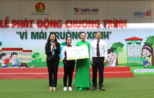 Chị Nguyễn Phạm Duy Trang, Phó Chủ tịch Thường trực Hội đồng Đội và đại diện Tập đoàn Thiên Long trao biểu trưng " Công trình măng non" cho Thầy và trò trường tiểu học Phương Liệt