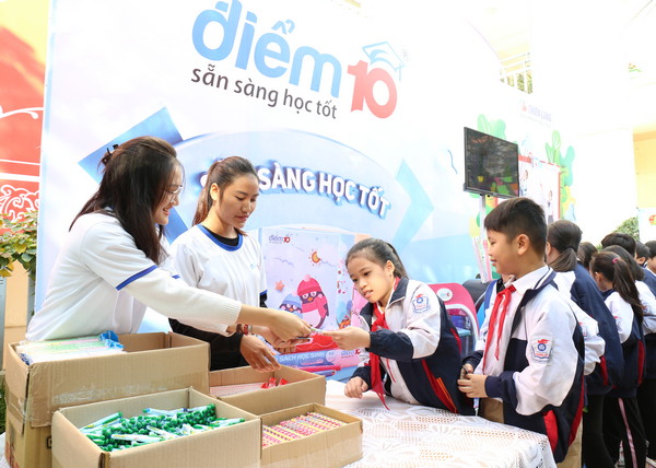 Học sinh trường tiểu học Phương Liệt nhận quà của Nhãn hàng dụng cụ học sinh điểm 10 sau khi tham gia chơi trò chơi tại lễ phát động