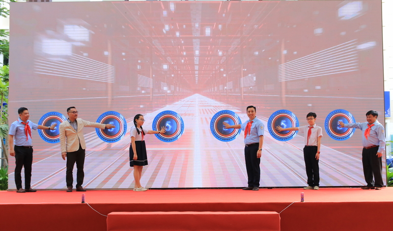 Các đại biểu và thiếu nhi thực hiện nghi thức phát động Sân chơi “Thiếu nhi Việt nam - Vươn ra thế giới” năm 2022