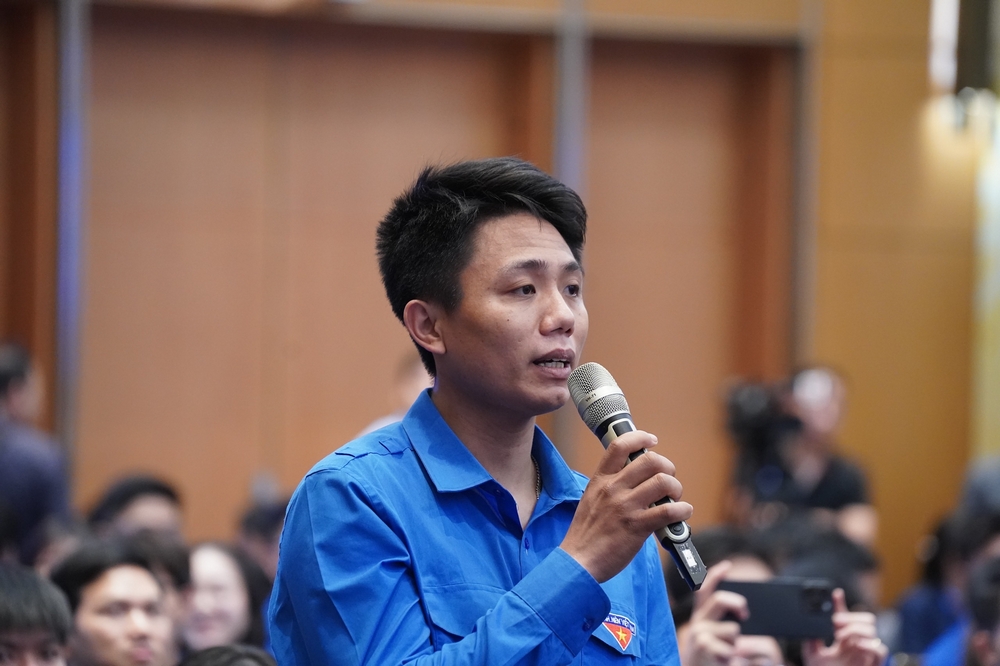 Bạn Nguyễn Thành Trung, Học sinh Trường THPT Chuyên Đại học Sư phạm đặt câu hỏi. Ảnh VGP/Nhật Bắc