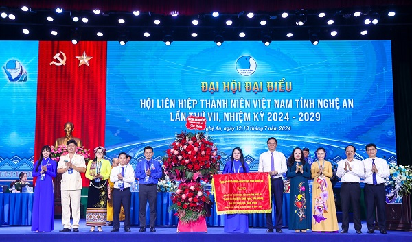 Phó Bí thư Tỉnh ủy Hoàng Nghĩa Hiếu cùng các đồng chí trong Ban Thường vụ Tỉnh ủy tặng trướng và hoa cho Hội Liên hiệp Thanh niên Việt Nam tỉnh Nghệ An. Ảnh: Đức Anh