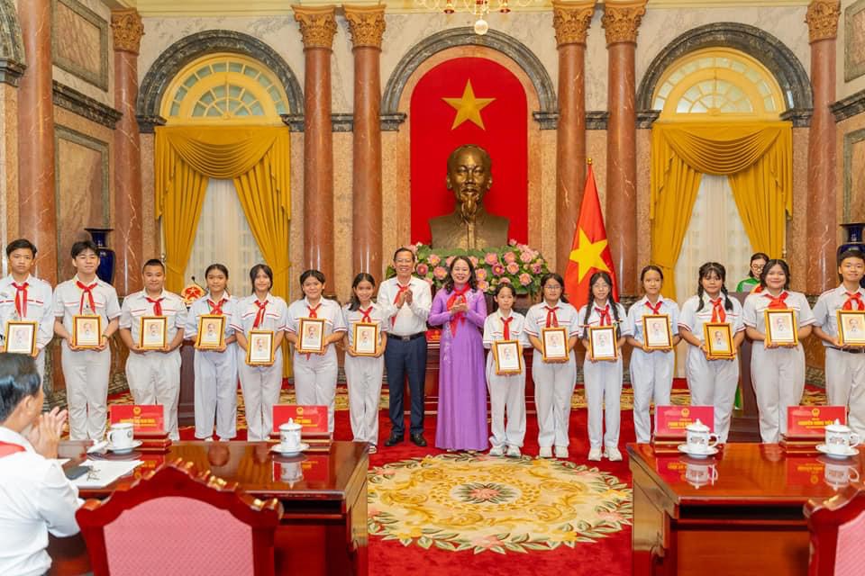 Đại biểu thiếu nhi báo cáo thành tích với Phó Chủ tịch nước