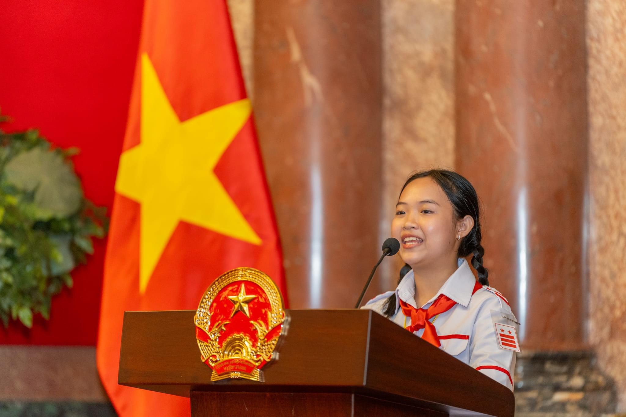 Bày tỏ xúc động và niềm vui khi gặp mặt Đoàn, Phó Chủ tịch nước Võ Thị Ánh Xuân chuyển lời thăm hỏi ân cần, thân thiết và lời chúc tốt đẹp của Chủ tịch nước Tô Lâm đến 70 đội viên, thiếu nhi, phụ trách Đội tiêu biểu của Thành phố mang tên Bác.