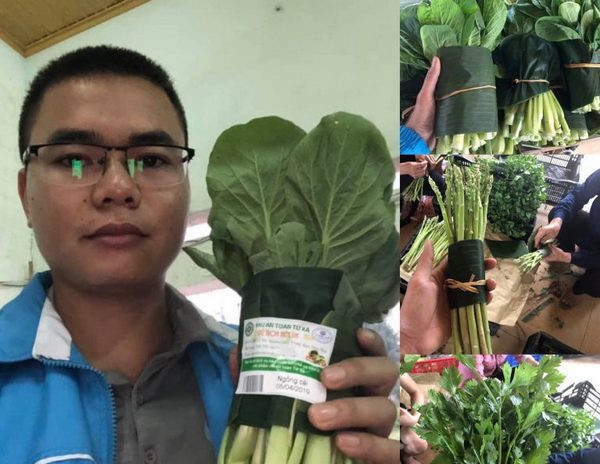 Anh Nguyễn Văn Nghĩa và sản phẩm được dán tem nhãn chứng nhận sản phẩm an toàn của HTX Tứ Xã. Hiện HTX đang thử nghiệm chuyển đổi việc gói rau bằng túi nilon sang lá chuối thân thiện với môi trường. Ảnh: Theo Agrinews