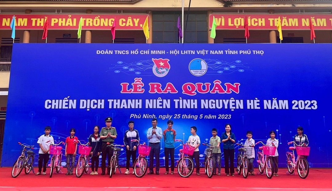 Đồng chí Phùng Khánh Tài - Phó Bí thư Thường trực Tỉnh ủy và đồng chí Bùi Đức Giang - UVBCH Trung ương Đoàn, Bí thư Tỉnh đoàn, Chủ tịch Hội LHTN tỉnh Phú Thọ trao tặng quà cho các em thiếu nhi tại lễ ra quân chiến dịch thanh niên tình nguyện hè