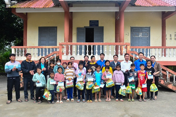 Thường trực Tỉnh Đoàn, Huyện Đoàn Đồng Xuân tặng quà cho các em học sinh có hoàn cảnh khó khăn ở xã Xuân Lãnh.
