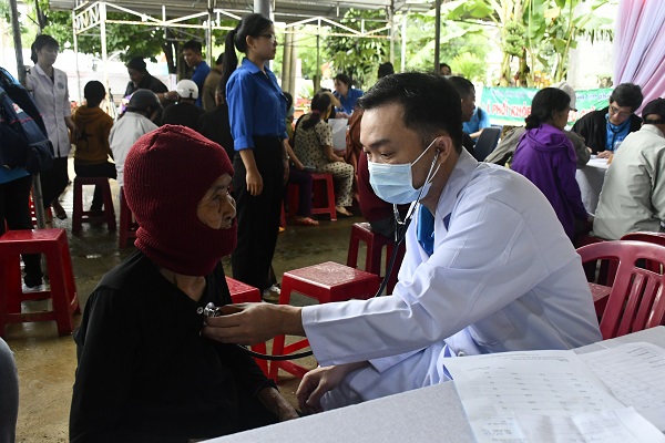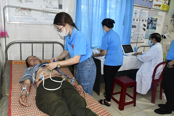 Các y, bác sĩ thuộc Viện tim TP. Hồ Chí Minh khám sàn lọc bệnh tim mạch cho người dân có hoàn cảnh khó khăn huyện Sơn Hòa.