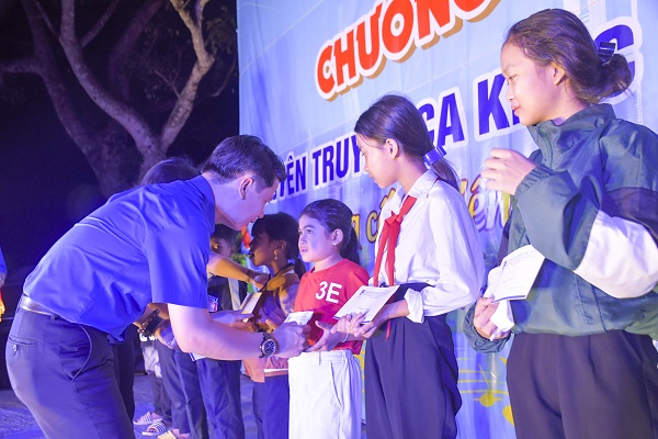 Đồng chí Lương Minh Tùng, Bí thư Tỉnh Đoàn, Chủ tịch Hội LNTN Việt Nam tỉnh trao quà cho học sinh có hoàn cảnh khó khăn