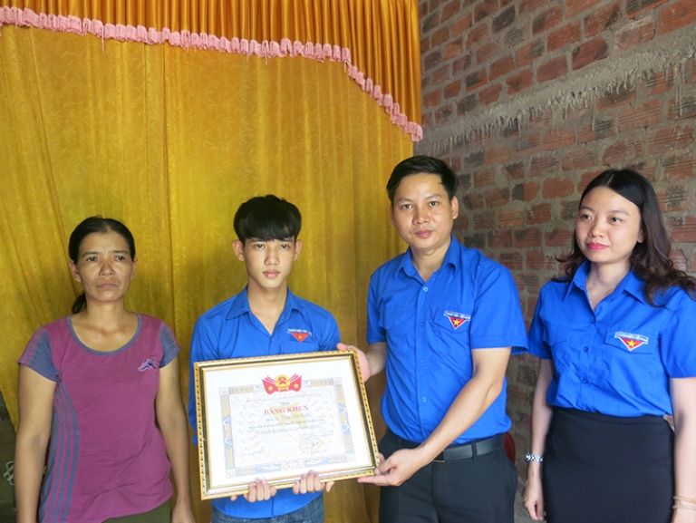 Tặng bằng khen cho em Trần Văn Nam, học sinh lớp 10, Trường THPT Nguyễn Trãi, ở thôn Cù Lạc 1, xã Sơn Trạch, huyện Bố Trạch